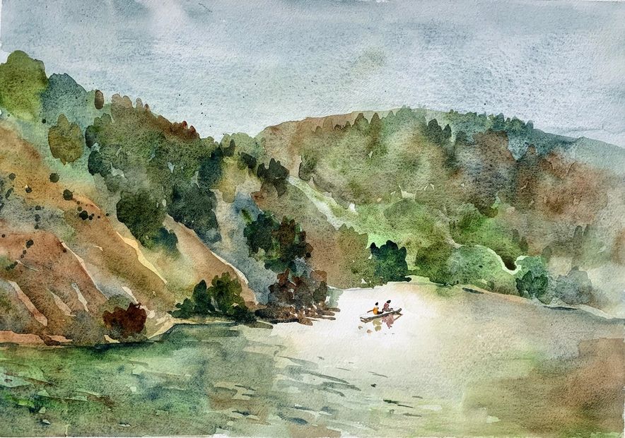 This was done en plein air at Stevens Creek Canyon Park. The figures in the boat were invented and placed at the focal point.