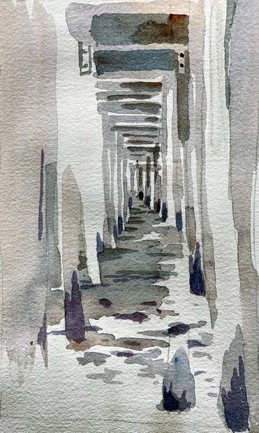 These structural piers in sharp perspective supporting the wharf above remind me of a cathedral,