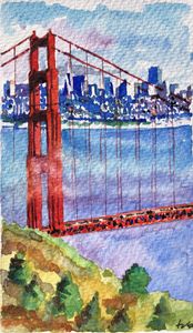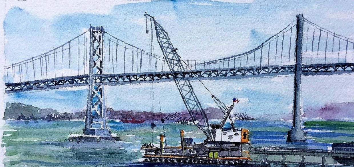 What drew me to this was the criss-crossing of the truss from the crane on the Bay and the trusses under the road of the mighty Bay Bridge - what a difference in scale and load carrying capacity! And yet, when they cross, they just cross. This was done en plein air sitting in the farmer's market outdoor plaza at the San Francisco Ferry Building.
