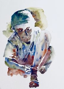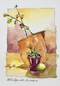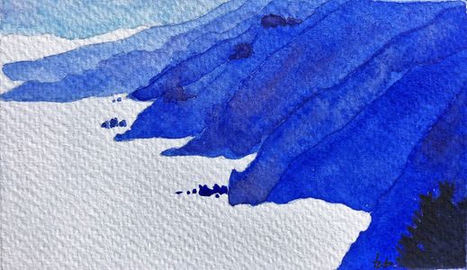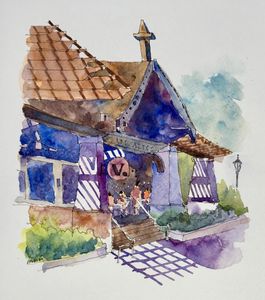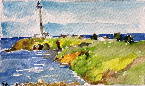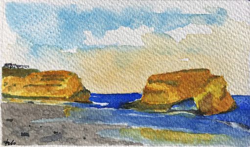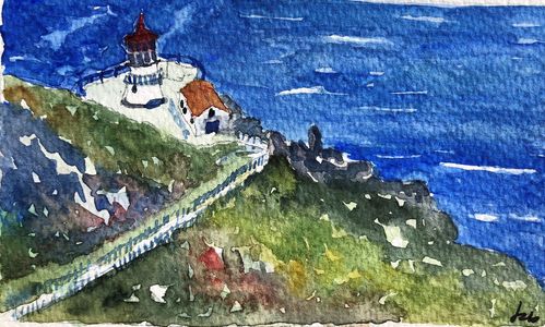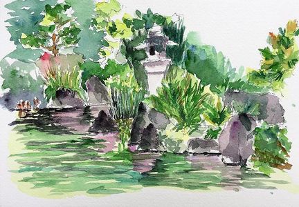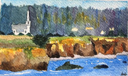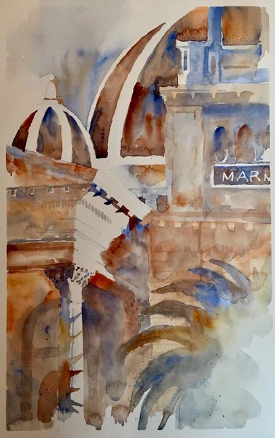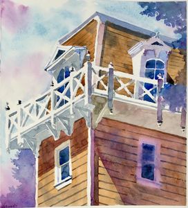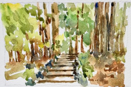 Painted en plein air on a windy day, I had to constantly be careful that my paper, supplies, and hat didn't blow away. I was quite at risk of the same perilous prospect.