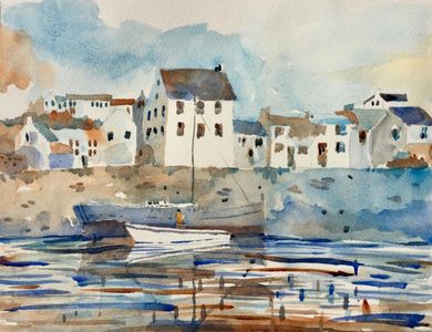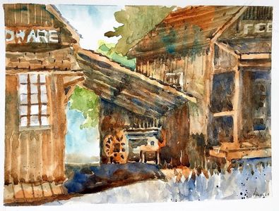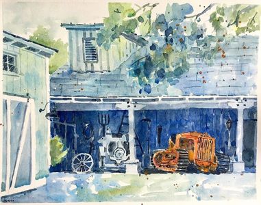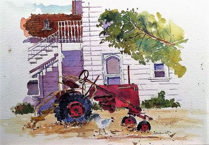 I was drawn to this tractor and the shadows on the building beyond. When I was almost done with this painting, I realized it needed some life, so was happy to put in one of the hens that was pecking at my palette and water container. I think that was what her clucking was all about in the first place.