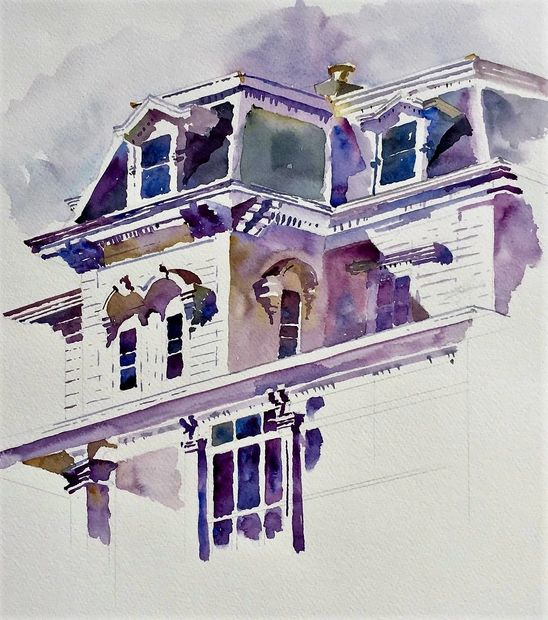 The perspective of this building was challenging enough without having to do the drawing standing up at my easel. This was completed en plein air.