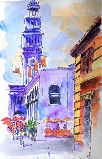 Painted en plein air sitting on the sidewalk, this is a pen and ink sketch under watercolor. What drew me was the sharply contrasting colors of the orange building against the complementary blue of the ferry building beyond.