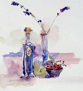 A collection of eclectic items from all over - lavender from a neighbor's yard, vinegar from my daughter's trip to Italy, and the glass cherries from a quaint store in Potrero Hill in San Francisco.